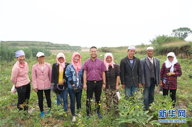 來自福建長(zhǎng)樂的林錦云(右五)在寧夏固原市河川鄉(xiāng)與當(dāng)?shù)剞r(nóng)戶合影(8月28日攝)。2014年,林錦云通過土地流轉(zhuǎn)方式,承包了河川鄉(xiāng)1.5萬畝荒山,打造油用牡丹生產(chǎn)基地。目前,林錦云種下的7600畝油用牡丹已經(jīng)開始受益,公司已就近吸納村民300多人就業(yè),其中建檔立卡戶39戶,人均年收入2萬多元。 新華社記者姜克紅攝