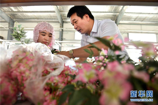 潘文賢(右)在寧夏固原市隆德縣隆德人造花工藝有限公司向員工介紹人造花制作技術(shù)(8月29日攝)。來自福建南安市的潘文賢2011年在隆德縣創(chuàng)辦隆德人造花工藝有限公司,成為隆德縣第一家集研發(fā)、生產(chǎn)和銷售于一體的勞動(dòng)密集型出口創(chuàng)匯企業(yè),產(chǎn)品遠(yuǎn)銷歐美及東南亞等國家和地區(qū)。截至2017年底,已成功打造隆德縣前莊村、紅崖社區(qū)等5個(gè)扶貧車間,幫助150人穩(wěn)定就業(yè)、218戶外加工戶靈活增收,帶動(dòng)300多個(gè)建檔立卡戶增收脫貧。 新華社記者郭緒雷攝