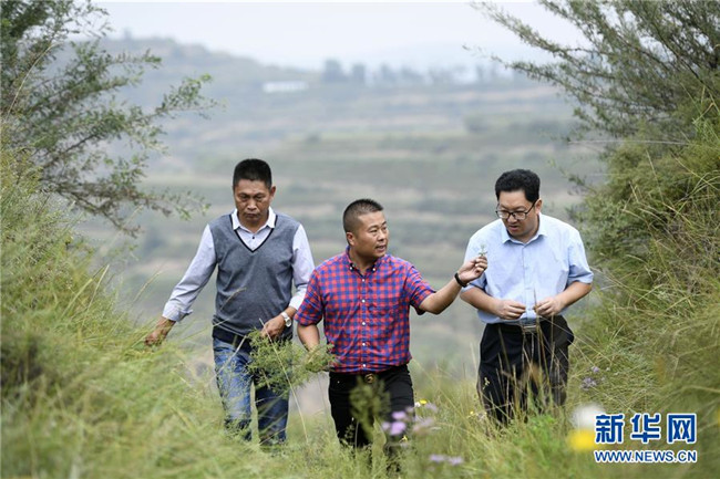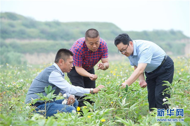 來自福建長(zhǎng)樂的林錦云(中)在寧夏固原市河川鄉(xiāng)與福建對(duì)口支援農(nóng)業(yè)專家(右)交流牡丹種植技術(shù)(8月28日攝)。2014年,林錦云通過土地流轉(zhuǎn)方式,承包了河川鄉(xiāng)1.5萬畝荒山,打造油用牡丹生產(chǎn)基地。目前,林錦云種下的7600畝油用牡丹已經(jīng)開始產(chǎn)生效益,公司已就近吸納村民300多人就業(yè),其中建檔立卡戶39戶,人均年收入2萬多元。 新華社記者姜克紅攝