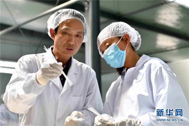 黃玉仁(左)在寧夏固原市隆德縣寧夏黃土地農(nóng)業(yè)食品有限公司與員工交流馬鈴薯粉絲制作技術(shù)(8月29日攝)。來自福建莆田的黃玉仁2017年在隆德縣創(chuàng)辦寧夏黃土地農(nóng)業(yè)食品有限公司,利用當(dāng)?shù)伛R鈴薯種植優(yōu)勢(shì),制作馬鈴薯深加工產(chǎn)品,促進(jìn)當(dāng)?shù)伛R鈴薯銷售和農(nóng)民增收。目前公司已建成4條生產(chǎn)線,為當(dāng)?shù)?0多名百姓解決就業(yè)。 新華社記者郭緒雷攝