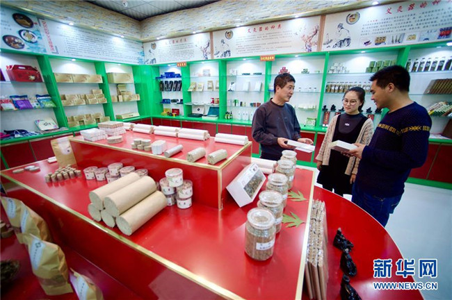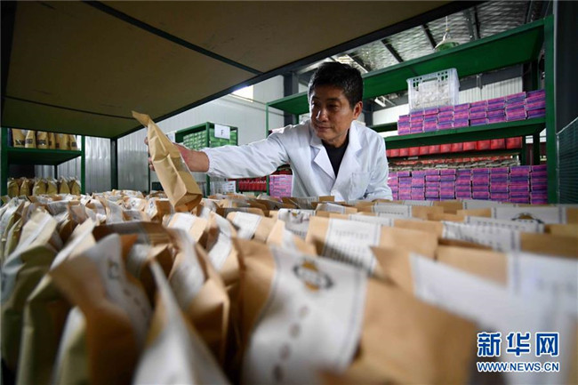 林玉清在寧夏固原市西吉縣寧夏澤艾堂生物科技有限公司查看艾草產(chǎn)品(8月30日攝)。來自福建莆田的林玉清2017年3月在西吉縣成立寧夏澤艾堂生物科技有限公司,依托西吉縣優(yōu)質(zhì)的艾草種植條件,采用“公司+合作社+農(nóng)戶”的訂單農(nóng)業(yè)合作模式,與吉強(qiáng)、新營(yíng)等鄉(xiāng)鎮(zhèn)種植專業(yè)合作社合作建成艾草種植基地11個(gè)、推廣種植艾草6000畝,為當(dāng)?shù)厝罕娒撠氈赂讳伨托侣纷印P氯A社記者郭緒雷攝