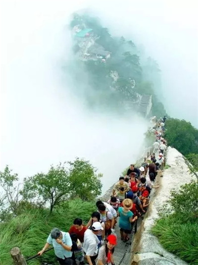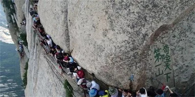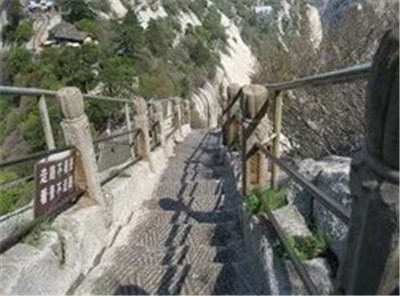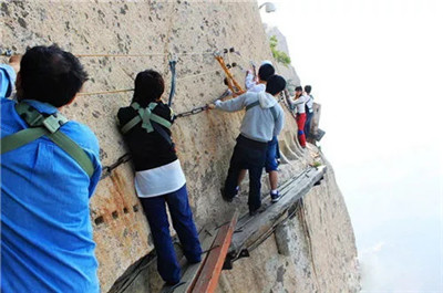 具有700多年歷史的長空棧道,在華山南峰東側(cè)山腰的萬仞絕壁上鑿出來的幾個踏腳之處,鑲嵌石釘搭木椽搭建了一個百余米懸空的棧道,讓人望而卻步,如果你有恐高癥,僅僅看一眼都會讓你驚恐萬分。2013年,著名旅游網(wǎng)站“Smarter Travel”盤點(diǎn)全球最恐怖懸崖步道,將華山長空棧道列為全球十大最恐怖的懸崖步道之一。
