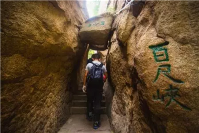 過(guò)千尺幢就是百尺峽。說(shuō)千尺幢艱險(xiǎn),是每個(gè)爬華山的人都能體驗(yàn)得到的,而百尺峽就不是那樣的險(xiǎn)要了。但當(dāng)你上了百尺峽以后,眼前的一幕會(huì)讓人產(chǎn)生驚訝和不安。原來(lái),在兩壁夾縫處有一塊懸石,似落非落的樣子,上面寫著“驚心石”三個(gè)字。人須從石下穿過(guò),讓人不由得擔(dān)心它的穩(wěn)定性來(lái),許多人產(chǎn)生畏葸不前的情緒來(lái)。待鼓足勇氣從石頭下走過(guò)去,回頭一看,又有“平心石”三個(gè)字在石頭上,才知是庸人自擾,虛驚一場(chǎng)。