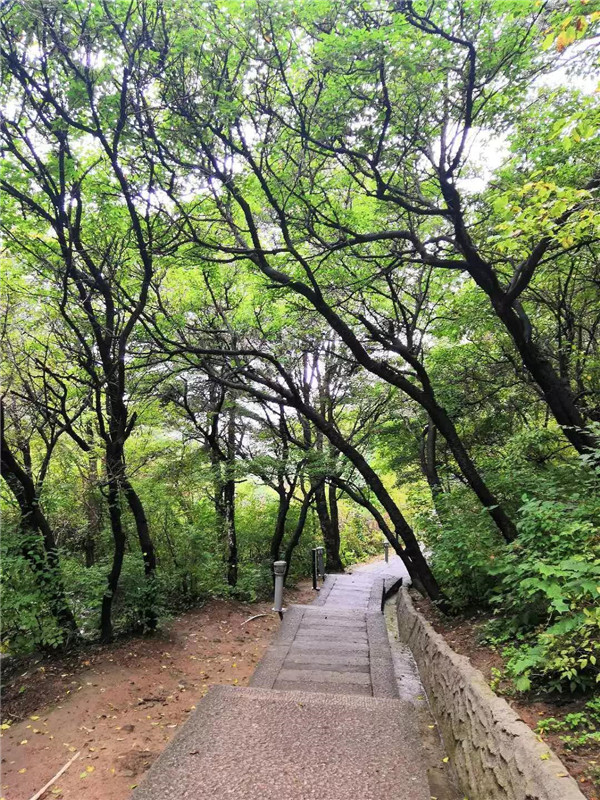 清晨,陽光穿過樹林灑在石階上,斑駁的光影隨風自在地搖晃。茂密的樹林蒸騰起無數(shù)看不見的水汽,溫潤的撲在臉上,令人心曠神怡。