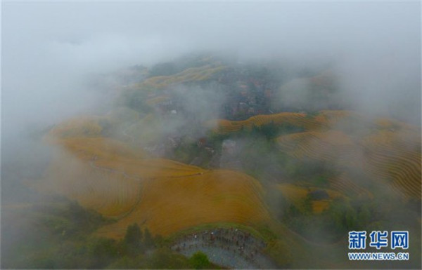 10月16日,游客在秋雨中欣賞龍脊梯田秋色(無(wú)人機(jī)拍攝)。金秋時(shí)節(jié),廣西龍勝各族自治縣龍脊梯田美如畫卷。 新華社記者 黃孝邦 攝