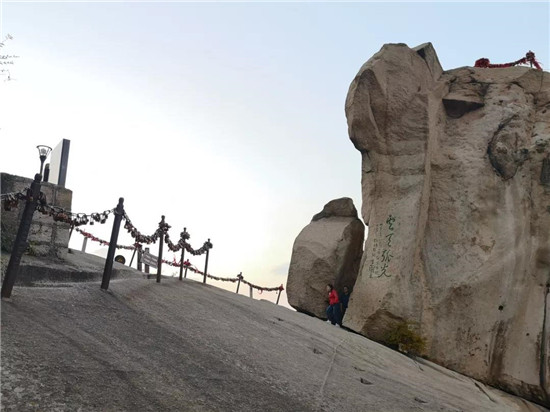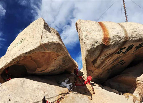 華山以石著名,每一處奇石都有一個美麗而動人的傳說。過了擦耳崖,看到的這兩塊石頭叫“日月巖”,左邊的代表“日”,右邊的代表“月”,上面這四個字是“云天弧光”,有時在夜晚,這里會出現(xiàn)一道非常耀眼的光。相傳武則天當(dāng)年上華山走這里,看到這兩塊形似日月的石頭,就別出心栽地給自個兒的字號創(chuàng)造了一個“瞾”字,因為這兩塊奇石上頂青天,下臨空谷,唯我獨尊,是光明與權(quán)威的象征。
