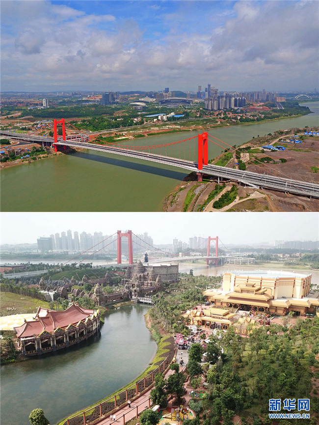 拼版照片。上圖為南寧五象新區(qū)良慶大橋(2016年6月24日,新華社記者 周華 攝);下圖為五象新區(qū)良慶大橋附近景觀(2018年8月8日,劉相初 攝)
