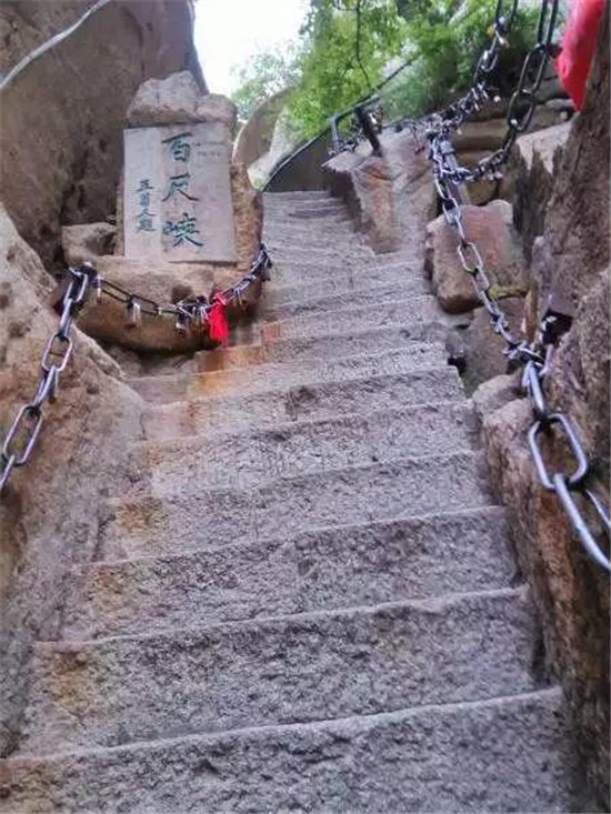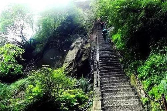 一是直上云頭。如千尺幢、上天梯、否梯、百尺峽等,開鑿于石隙崖壁,直上直下,有聳入云天之勢;二是凌空載道。一邊臨壁,一邊凌空,奇絕險(xiǎn)要。如南峰長空棧道、北峰至蒼龍嶺棧道;