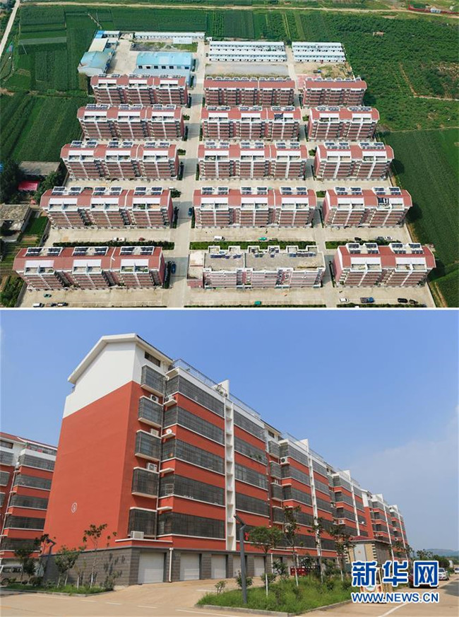 拼版照片(8月22日攝):上圖為無人機(jī)拍攝的山東費(fèi)縣朱田鎮(zhèn)崔家溝社區(qū);下圖為山東省臨沂市費(fèi)縣朱田鎮(zhèn)崔家溝社區(qū)的居民樓。崔家溝村是遠(yuǎn)近聞名的“光棍村”“貧困村中的貧困村”。2016年3月,崔家溝村在中央異地搬遷政策的扶持下,實(shí)現(xiàn)了整體搬遷,1600多口人搬到了鎮(zhèn)駐地。從此,昔日的“光棍村”,一躍進(jìn)入朱田鎮(zhèn)富裕村行列。新華社記者 王南 攝