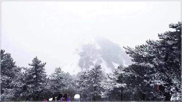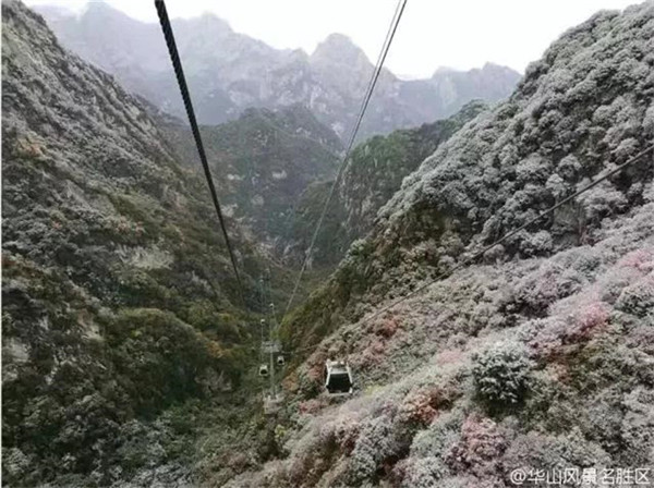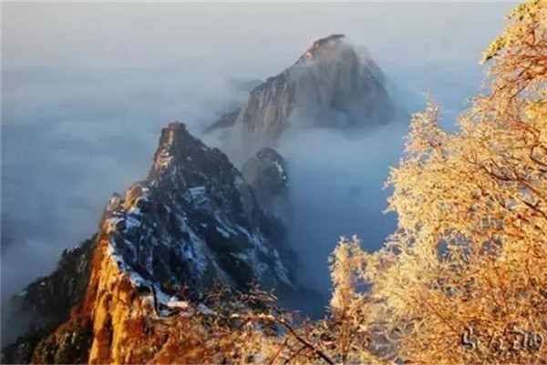 當(dāng)滿山的紅葉還依舊掛在樹(shù)枝,露出嬌羞的笑臉時(shí),秋末的華山,已經(jīng)下起了今年的第一場(chǎng)雪。放眼望去,整座山體好像被薄薄的彩衣包裹,若隱若現(xiàn)。
