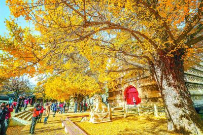 金秋時(shí)節(jié),京城各公園和景區(qū)落葉繽紛,美景如畫(huà)。昨天,北京石刻藝術(shù)博物館內(nèi)的真覺(jué)寺金剛寶座旁,兩株樹(shù)齡近600歲的古銀杏樹(shù)一片金黃,吸引市民觀賞留影。本報(bào)記者 武亦彬攝