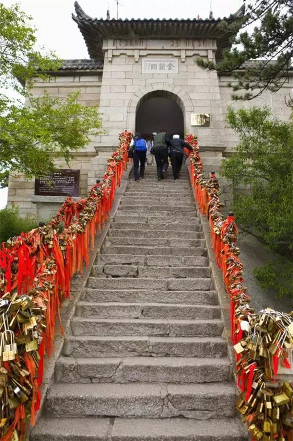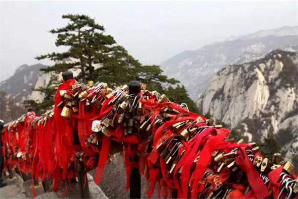 金鎖關(guān)北接五云峰,南控華山主峰,東西兩側(cè)壑深千丈,關(guān)前僅有一米完的臺階石徑。環(huán)周古松蒼翠,奇石林立,常有祥云環(huán)繞,風(fēng)光非常迤麗。“但有女兒初長成,便為三秦姣姣容。”說的就是奇險(xiǎn)天下第一山的華山除了以其奇、險(xiǎn)、秀而聞名遐邇之外,還別有一番令人動容的金鎖關(guān)風(fēng)景:關(guān)內(nèi)、關(guān)外登山路兩側(cè)的鐵索上,情侶鎖、平安鎖,重重疊疊,紅繩彩線迎風(fēng)搖曳,筑成一道美麗的愛情風(fēng)景線,鎖住對愛情的誓言,表達(dá)堅(jiān)如磐石的愛情忠貞!