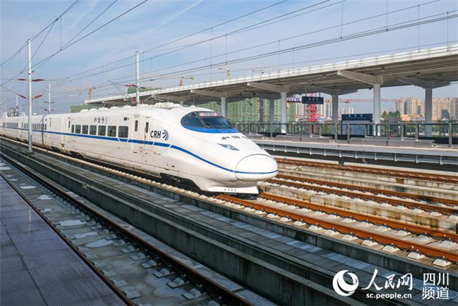 10月15日,綜合檢測動車組在成雅鐵路成都至蒲江(朝陽湖)段的崇州車站開展試驗檢測。(吳正琪 攝)
