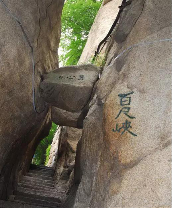 也叫“百丈崖”,過(guò)了千尺幢向北折即可到達(dá),是登華山的第二個(gè)險(xiǎn)境。這里山體峭陡壁立、四方如削,猶如斧子直辟而開(kāi),幾近垂直90度,在旁邊山體覆滿(mǎn)的墨綠植被的映襯下,華山的陽(yáng)剛挺拔之態(tài)盡顯。和千尺幢一樣,百尺峽也是巖隙險(xiǎn)道,有石階91級(jí),游人須挽鐵索而上。