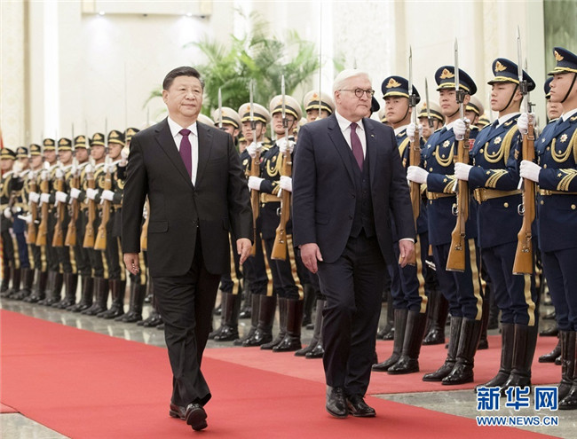 12月10日,國家主席習(xí)近平在北京人民大會(huì)堂同德國總統(tǒng)施泰因邁爾舉行會(huì)談。這是會(huì)談前,習(xí)近平在人民大會(huì)堂北大廳為施泰因邁爾舉行歡迎儀式?!⌒氯A社記者 龐興雷 攝