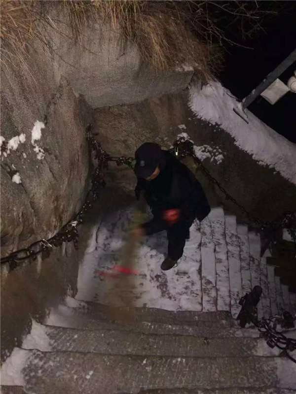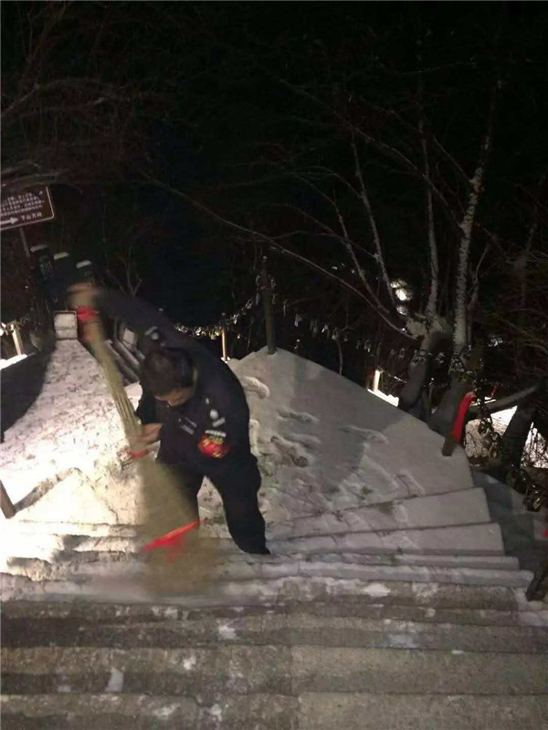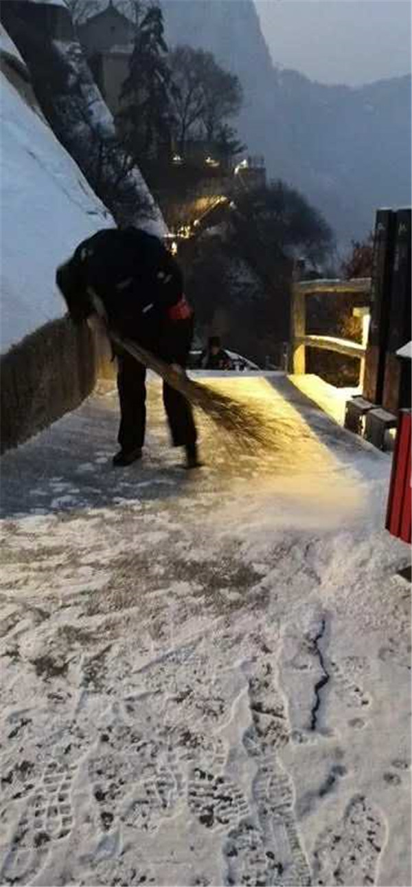 2019年元月4日,在小寒節(jié)氣到來之前,一場應(yīng)景的小雪降落在華山,華山主峰區(qū)的工作人員第一時間清掃積雪,為游客的安全保駕護航。