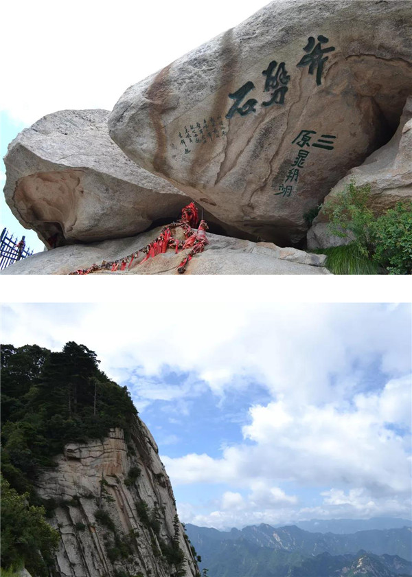 在南峰頂,孩子看到“天下絕無(wú)沉魚(yú)面,太華獨(dú)有落雁峰”的題刻,打趣我:“媽媽?zhuān)憬续櫻?,這里又叫落雁峰,真是和你有緣呢!快來(lái)這塊大石頭上落落腳,歇一歇!”“好啊!咱倆都爬累了,都歇一歇!”我為孩子的體貼欣慰!