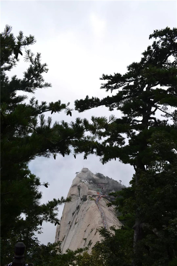 過(guò)金天宮,穿避詔崖,登南天門(mén),來(lái)到令人膽寒的長(zhǎng)空棧道附近。孩子一路上都在念叨要爬長(zhǎng)空棧道,我搜腸刮肚地想阻止她的冒險(xiǎn)念頭,可惜事與愿違,越阻止,越激起了孩子的好奇心,非爬長(zhǎng)空棧道不可!孩子拉著我的手急切地奔到長(zhǎng)空棧道上方升表臺(tái),站在這方三面凌空、軒轅帝與群仙會(huì)聚的“聚仙臺(tái)”上,才發(fā)現(xiàn)長(zhǎng)空棧道因故關(guān)閉了。我是長(zhǎng)長(zhǎng)舒了一口氣,孩子卻是失望至極!孩子不死心,拉著我抓著鐵鏈順著石道,又往下走了幾級(jí)石階,直到鐵鏈鎖閉的石門(mén)入口處。我倆手抓鐵鏈探身俯視,隱約可見(jiàn)絕壁上懸空的棧道。垂直的山壁上,幾株華山松挺直腰桿在生長(zhǎng),鐵鏈上拴的紅絲帶在迎風(fēng)飛舞。不知眼花了,還是心理作用,總覺(jué)得棧道在風(fēng)中輕輕晃動(dòng)。