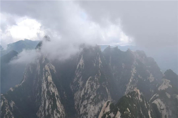 現(xiàn)在爬華山可不是“自古華山一條道”了,我們選擇坐西峰索道纜車(chē),凌空飛渡千山萬(wàn)壑。說(shuō)是千山萬(wàn)壑,其實(shí)華山是由一塊完整碩大的花崗巖石體構(gòu)成的。《山海經(jīng)》記載:“太華之山,削成而四方,其高五千仞,其廣十里。”真的很難想像,這么連綿起伏、巨大的山體,其實(shí)是一個(gè)群峰競(jìng)秀的整體。華山,就是這么神奇!