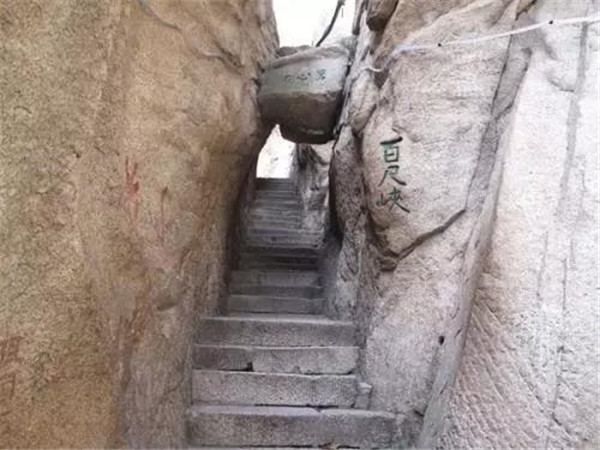 “千尺幢”在華山峪古道“回心石”上,是經(jīng)華山峪登主峰的必經(jīng)之道。這里原為一崖間裂隙,直立70度,后來人們沿隙鑿?fù)爻陕?,有石階370級(jí),階寬僅容半足,游人登臨時(shí),仰視一線天,俯視若臨深井。