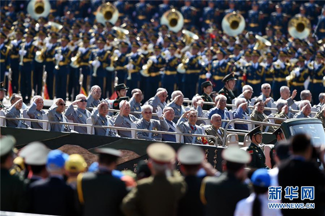 2015年9月3日,中國(guó)人民抗日戰(zhàn)爭(zhēng)暨世界反法西斯戰(zhàn)爭(zhēng)勝利70周年紀(jì)念大會(huì)在北京隆重舉行。這是抗戰(zhàn)老兵乘車方隊(duì)通過天安門廣場(chǎng)。 新華社記者王定昶攝