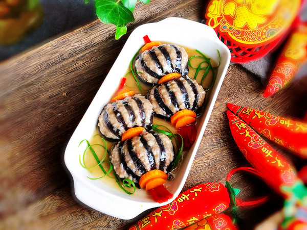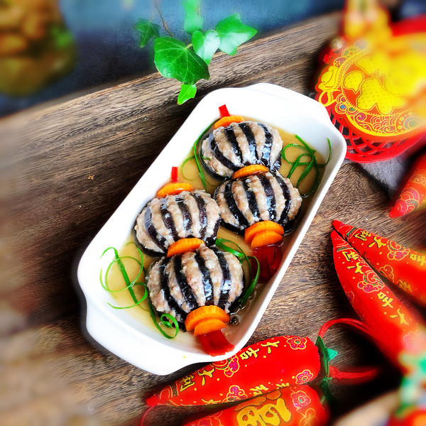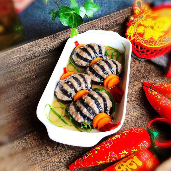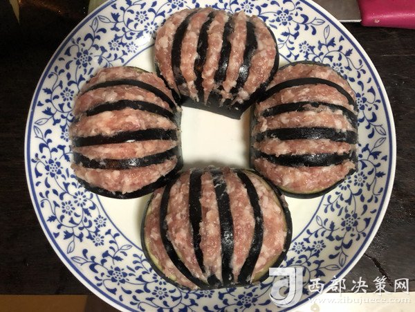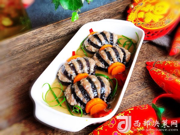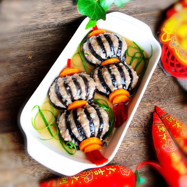 “今天買了一個大茄子,釀入豬肉餡,樣子像極了燈籠,如果你想顏色更深一點,那就在調(diào)肉餡的時候加點老抽甚至加點紅曲粉,最后調(diào)澆汁的時候可以調(diào)成酸甜的番茄汁味,那就看起來更加的紅紅火火了。不過我還是比較喜歡這種小清新的風格。這道菜一上桌,能把大魚大肉都比下去,好看好吃還喜慶。”