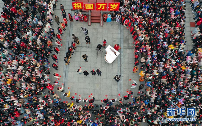 2月25日,湖南省衡陽市南華大學師生在開學主題活動上齊唱《我和我的祖國》(無人機拍攝)。  新華社發(fā)(曹正平 攝)