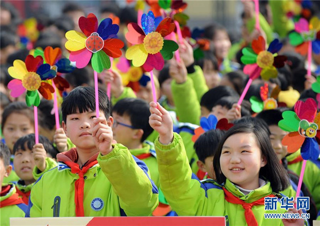 2月25日,安徽省亳州市風華桐鄉(xiāng)路小學的學生們在新學期主題活動上舞動風車。 新華社發(fā)(張延林 攝)