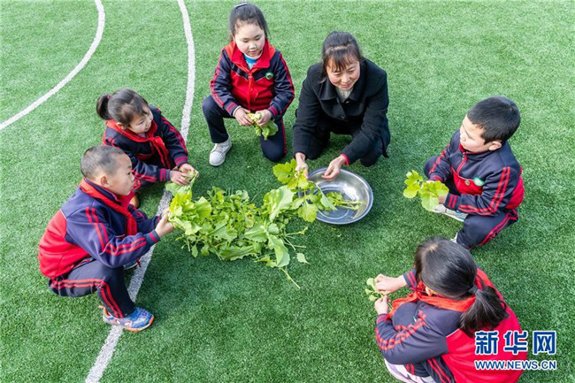 2月25日,在重慶市南川區(qū)慶元鎮(zhèn)福壽村小,教師黃先群和孩子們清洗他們在校園里種的蔬菜,為午飯做準備,這所“微小學”只有一名教師和五名學生。新華社發(fā)(瞿明斌 攝)