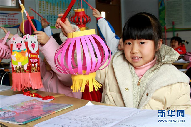 2月25日,在山東青島西海岸新區(qū)第二實驗小學,學生在開學第一課上展示自己制作的春節(jié)主題作品。新華社發(fā)(王培珂 攝)