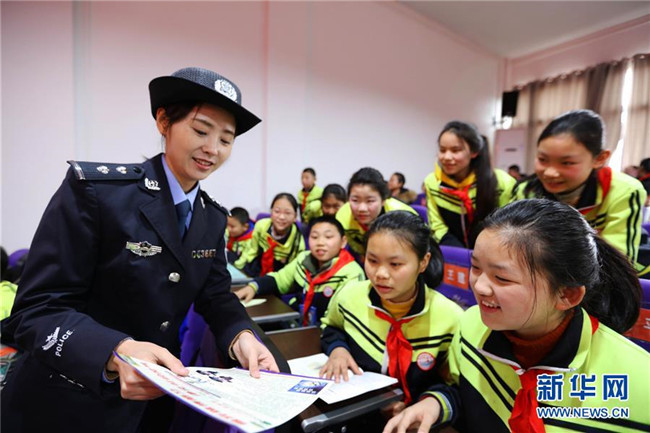 2月25日,在貴州省赤水市第三小學,民警在開學第一課上給學生們講解校園安全知識。 新華社發(fā)(王長育 攝)