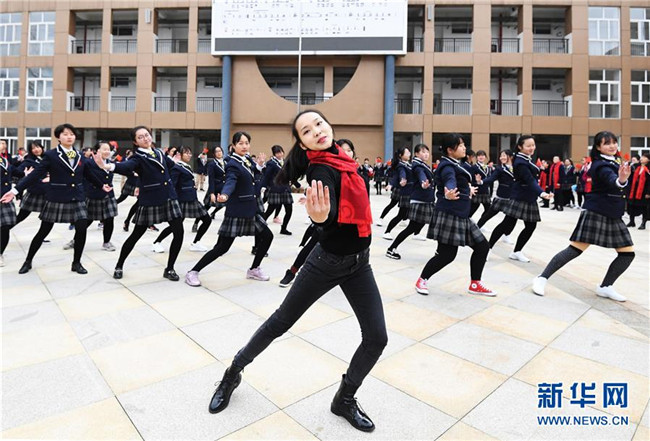 2月25日,貴州省貴陽市南明區(qū)甲秀高中的師生在開學主題活動上表演“快閃”節(jié)目《我和我的祖國》。新華社發(fā)(趙松 攝)