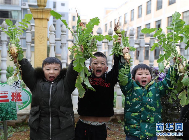 2月25日,在貴州省銅仁市玉屏侗族自治縣平溪街道第二幼兒園,孩子們在開學主題活動上展示自己拔的蘿卜。新華社發(fā)(胡攀學 攝)