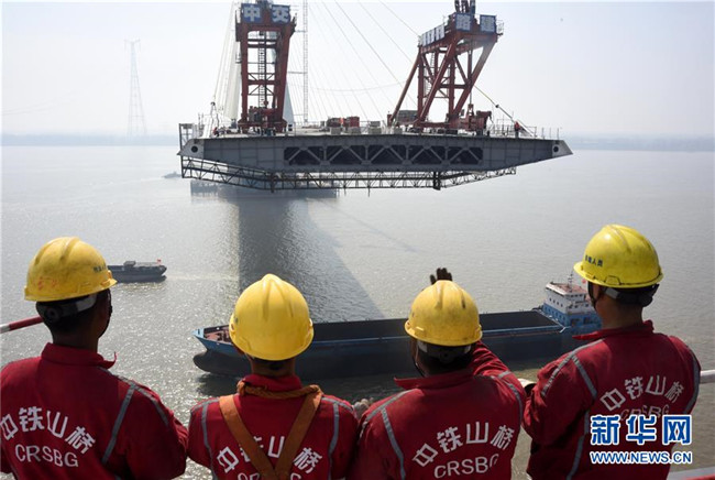 3月13日,在安徽池州長江公路大橋建設現(xiàn)場,施工人員在關注鋼箱梁吊裝進度。新華社發(fā)(過仕寧 攝)