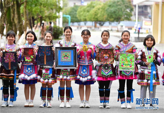 在融水苗族自治縣民族中學(xué),女童班的學(xué)生在展示刺繡作品(3月22日攝)。 新華社記者 黃孝邦 攝