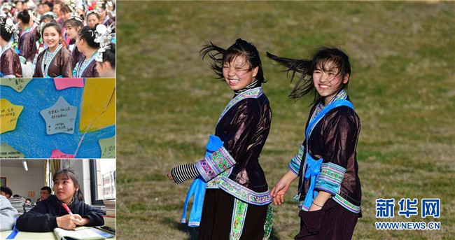 這是一張拼版照片:右圖為韋迎春(右)和同學(xué)在一起(2月6日攝);左上圖為韋迎春(中)在家鄉(xiāng)的“打同年”活動(dòng)中(2月7日攝);左中圖為韋迎春在小卡紙上寫下的夢(mèng)想(3月22日攝);左下圖為韋迎春在課堂上聽課(3月22日攝)。韋迎春來(lái)自融水苗族自治縣桿洞鄉(xiāng)堯告村,目前在融水民族高中讀高一。 新華社記者 黃孝邦 攝