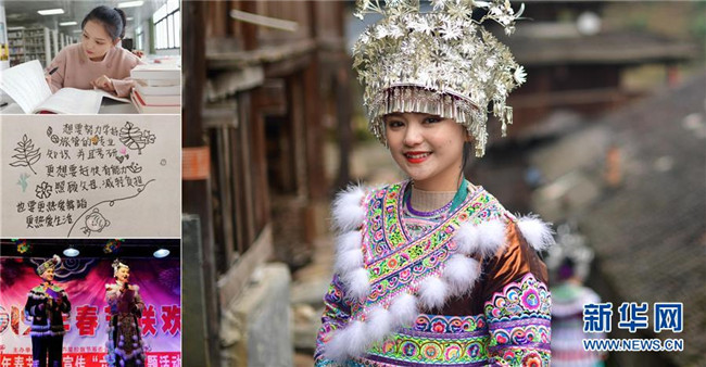這是一張拼版照片:右圖為楊琳詩(shī)瑤(2月16日新華社記者黃孝邦攝);左上圖為楊琳詩(shī)瑤在學(xué)校圖書館里學(xué)習(xí)(3月23日攝,楊琳詩(shī)瑤供圖);左中圖為楊琳詩(shī)瑤在紙上寫下的夢(mèng)想(3月23日攝,楊琳詩(shī)瑤供圖);左下圖為楊琳詩(shī)瑤(右)在家鄉(xiāng)主持苗寨的春節(jié)聯(lián)歡晚會(huì)(2月10日新華社記者黃孝邦攝)。楊琳詩(shī)瑤是融水苗族自治縣桿洞鄉(xiāng)桿洞村的苗族姑娘,去年以優(yōu)異成績(jī)考上廣西民族大學(xué)。 新華社發(fā)
