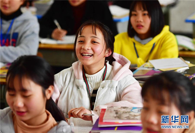 韋蓮秀(中)在課堂上(3月13日攝)。韋蓮秀來(lái)自融水苗族自治縣桿洞鄉(xiāng)百秀村,目前在桿洞中學(xué)讀初中。 新華社記者 黃孝邦 攝