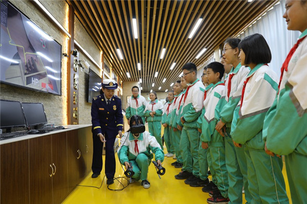 學(xué)生們?cè)趯幭闹行W(xué)消防科普體驗(yàn)館里的VR虛擬體驗(yàn)區(qū)體驗(yàn)。
