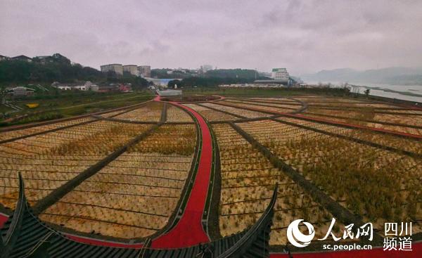 從高處俯瞰五糧液江北園區(qū)尾水凈化生態(tài)濕地,有序排列的廢水處理管道和景觀(guān)建筑組成的巨型企業(yè)標(biāo)志,鑲嵌在岷江岸邊,被一片翠綠簇?fù)怼?br />