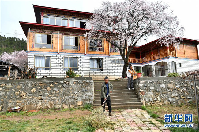 4月2日,波密縣古鄉(xiāng)嘎朗村的德青旺姆(右)和弟弟多頓扎巴在打理自家民宿。 新華社記者 李鑫 攝