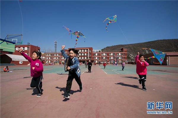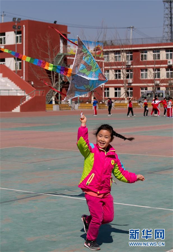 4月2日,門頭溝區(qū)妙峰山民族學(xué)校附屬幼兒園小朋友在操場(chǎng)上放風(fēng)箏。新華社發(fā)(侯繼慶 攝)