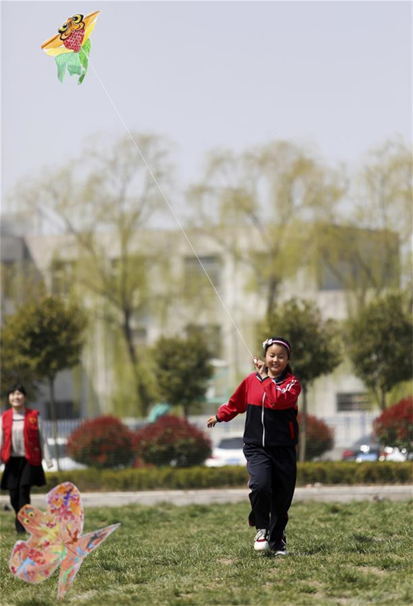 4月3日,山東臨沂市郯城縣郯城街道十里小學(xué)的學(xué)生在校園放飛風(fēng)箏。 新華社發(fā)(張春雷 攝)