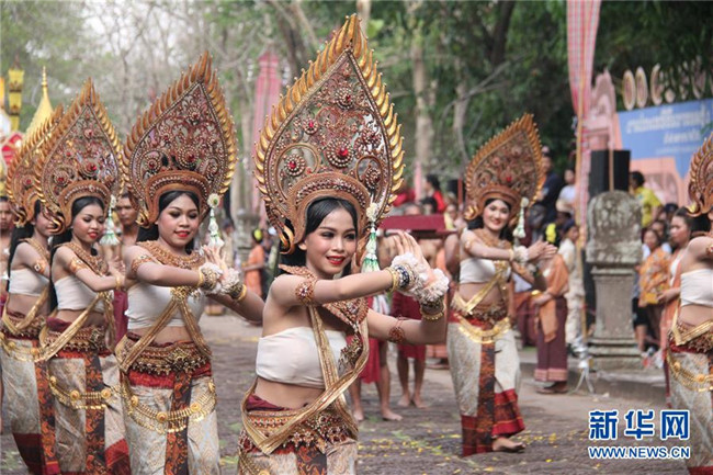 4月5日,在泰國武里南府,當?shù)嘏源虬绯上膳臉幼釉谂羶z隆寺前跳舞。新華社記者 楊舟 攝