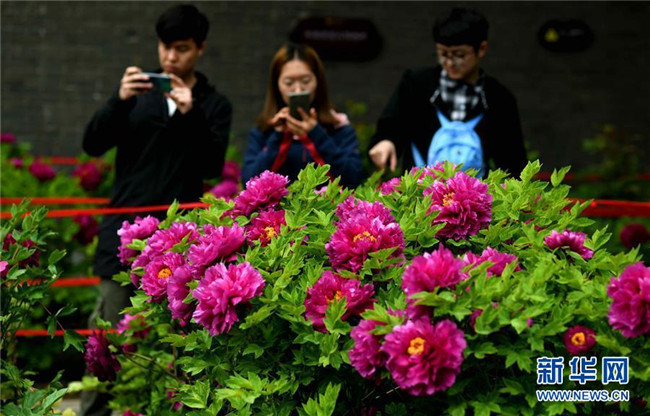 4月13日,游客在石家莊市正定榮國(guó)府影視基地游覽拍照。時(shí)下,河北石家莊正定榮國(guó)府影視基地內(nèi)的牡丹花次第開(kāi)放,在春雨的滋潤(rùn)下顯得格外晶瑩剔透、美麗嬌艷。 新華社發(fā)(陳其保 攝)