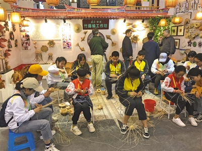 學(xué)生藝術(shù)實(shí)踐工作坊,來(lái)自福建安溪的小學(xué)生展示竹藤編。記者 馮琪 攝