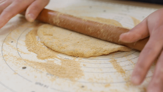 13.在硅膠揉面板上撒上黃豆粉,將溫熱的糯米面團放在面板上。