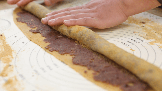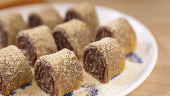 20.將黃豆粉用篩網(wǎng)均勻的撒在小卷上,大功告成啦,給家人露一手吧