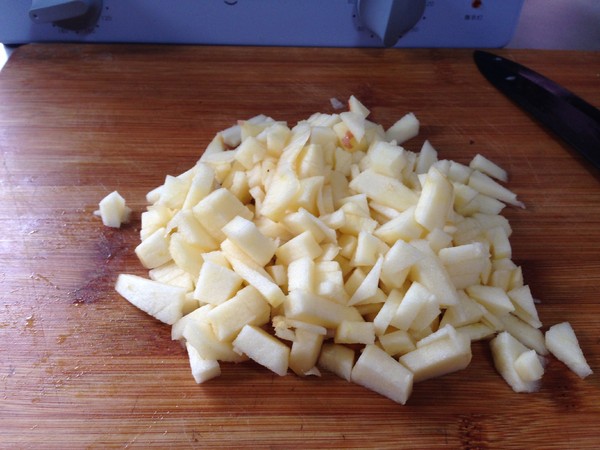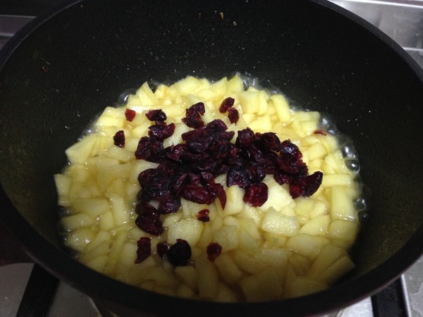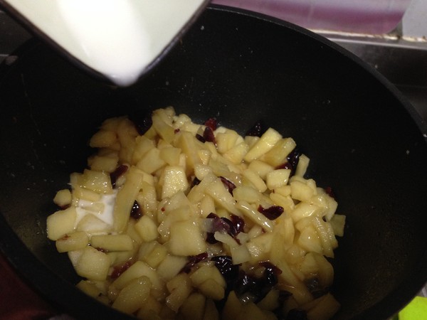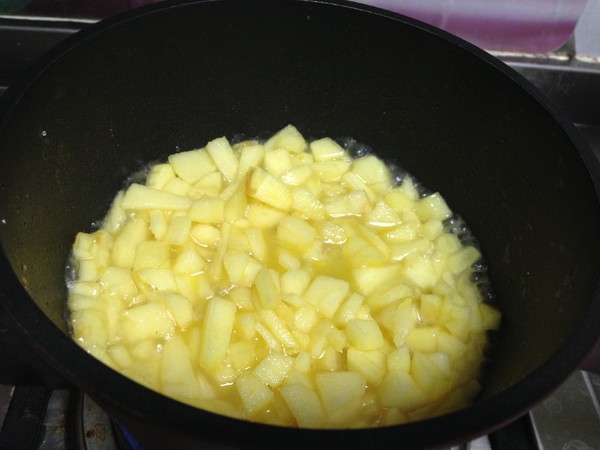 6.倒入少許水淀粉收汁冷卻備用,加入水淀粉可以讓蘋果丁口感會更綿滑