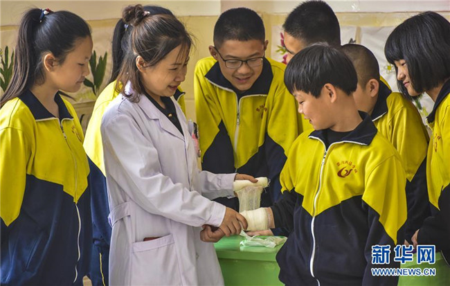 5月8日,在衡水市景縣黎陽學校,景縣中醫(yī)院醫(yī)護人員為學生演示傷口包扎急救。新華社記者 李曉果 攝